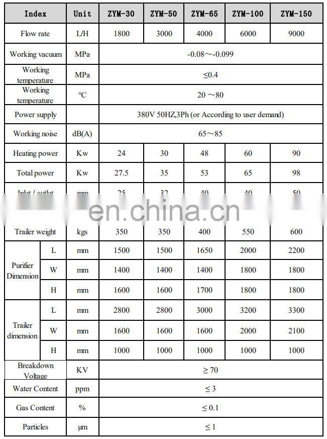 ZYM trailer oil purifier is a double-stage vacuum oil purifier, which canquickly and effectively remove moisture, gas (acetylene, hydrogen, methane, etc.) and impurities from the insulating oil, to restore and improve the insulating oil. The filtered oil can effectively ensure the safe and normal operation of power equipment.