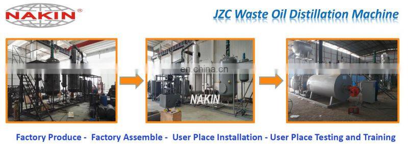 waste oil distillation machine heat the waste oil to (from 110℃ to 350℃) different temperature under high vacuum condition, making hydrocarbon molecules break out, and re-order combination, forming diesel oil, lubricating base oil etc. JZC machine is very