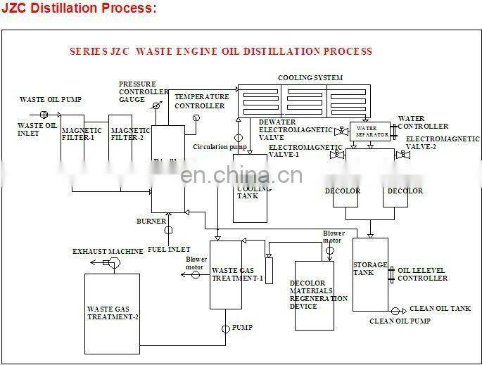 This equipment adopts physicochemical way to polymerize, passivity, absorb, eliminate impurities and harmful contaminants. JZC waste oil distillation machine heat the waste oil to (from 110℃ to 350℃) different temperature under high vacuum condition, making hydrocarbon molecules break out, and re-order combination, forming diesel oil, lubricating base oil etc. JZC machine is very suitable for the small oil refinery company, also for the small oil company who want to make the oil by self.