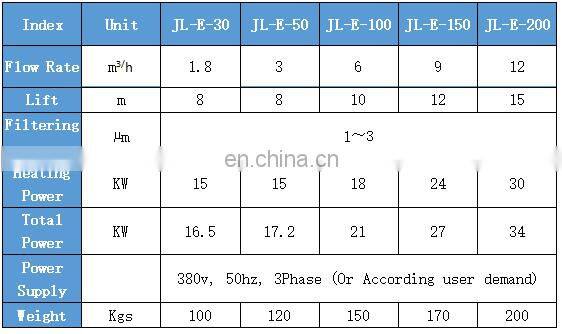 JL-E High Viscosity Oil Purifier is mainly used for filtering and removing impurities from high viscosity gear oil (Viscosity 150#, 220#, 320#, 460# etc.). The gear oil can be heated to a certain temperature in advance to low the viscosity of the oil, increasing the oil flowing capability and transfer by a high viscosity oil pump. The machine is equipped with a constant temperature control system and a filter pressure alarm protection system, which make sure machine work safely and reliably. JL-E usually has three grades of filtering, and can also be configured with more than three grades of filtering according to customer requirements. This machine can also be used for long-distance, high-lift oil transfer and oil injection.