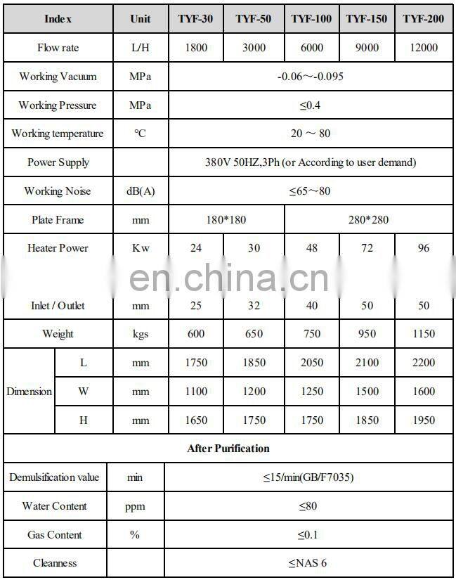 Company has passed ISO9001.2015 quality management system certification and CE European certificate. Our oil purifier machine only use the high quality parts, which is reliable quality and excellent performance. The company has complete testing instruments and testing equipment. All products are strictly tested before leaving the factory to ensure that each product is qualified to leave the factory.