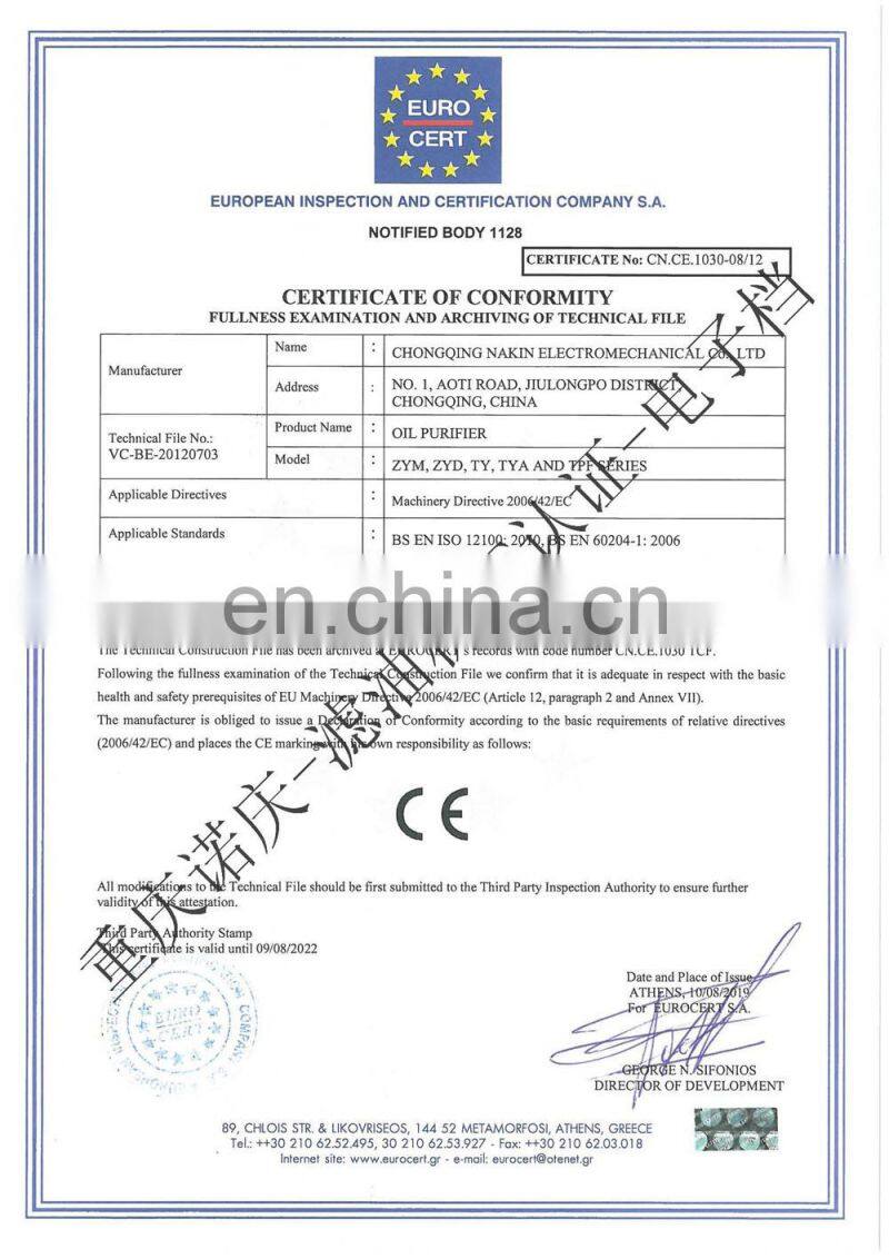 Company has passed ISO9001.2015 quality management system certification and CE European certificate. Our oil purifier machine only use the high quality parts, which is reliable quality and excellent performance. The company has complete testing instruments and testing equipment. All products are strictly tested before leaving the factory to ensure that each product is qualified to leave the factory.