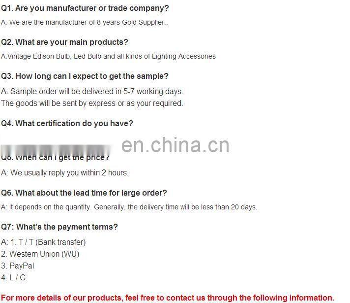 A19,A21,A23,ST58,ST64,T8,T9,T10,T38,T45,C35,FC35,G80,G95,G125 of edison antique bulbs series and LED edison bulbs with various of bulb accessories are our speciality, have been favored by customers in US, Europe, Australia and other countries in the world.