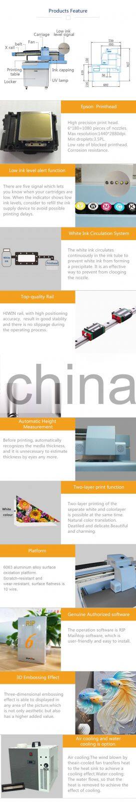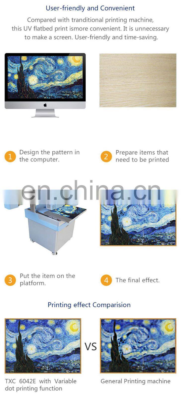 1, Ideal for customizing pre-manufactured items, promotional goods, fine art and unique signs 2, Precision and quality print on a wide variety of substrates including acrylic, wood, board, metal, glass, plastic, PVC, up to 150mm high and 30kg in weight 3, Print colourful images on demand, to personalise or customise small or medium-sized items, from a single object up to a short-run production runs 4, Produce 3D embossed and special effects using UV clear ink 5, Achieve colourful graphics on dark and clear substrates utilising TXC UV white ink and Image directly onto materials that are normally more difficult to adhere ink to, such as acrylic and glass, using the TXC primer. 6, The UV flatbed printer equipped with bi-directional printing function, it can increase printing speed and efficiency. 7, An automatic media height system for detecting the thickness of the substrate 8, A special positioning jig is available to align items easily on the printing table 9, A Head refresh Feature removes any ink remaining on the printheads and cleans the printhead surface to maintain the health of the printer. 10, Optional Rotary device available and optional vacuum table available