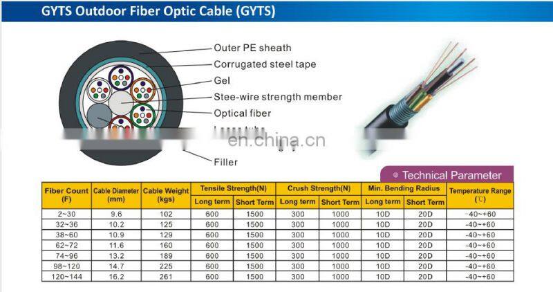 SM 9/125 G.652D 48Core GYTS Outdoor Cable Corrugated Steel Tape Cable Steel-wire Strength Member Cable