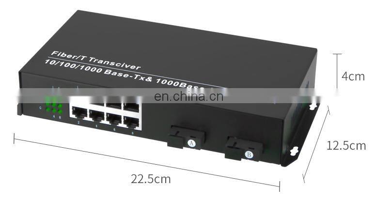 The 10/100 Mbps adaptive fast Ethernet fiber transceiver (also called photoelectric medium converter), built-in eight ports 10M/100Mbps adaptive switch, can convert eight independent 10 Base-T and 100 Base-TX twisted pair electrical signals to 100 optical signals. which extends the network transmission distance from the limit of 100 m of copper wire to 20 Km( single mode full duplex mode). Support two different network connection media types :10/100 Base-TX and 100 Base-FX, to realize data transmission between two network connection media by using switching technology and storage and forwarding technology. Support double fiber single mode and single fiber single mode multi-fiber transmission.