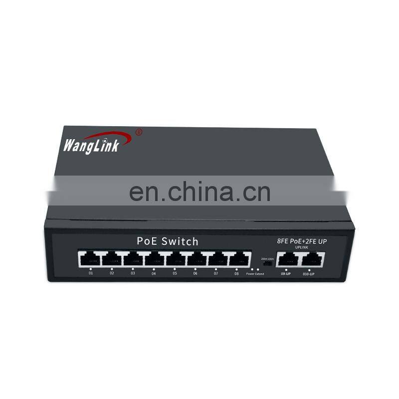 This product Wanglink 10/100Mbps 8 port Ethernet Network POE Switch with 2*10/100/1000Mbps UPLINK POE ethernet switch provided 8 ports 10/100M switch, including 1-8ports support PoE,IEEE 802.3af /at ISO, Single port power supply power 15.4W, total power 125W, you can choose to insert 8 ip-based ieee802.af/at international standard POE devices, like a wireless access point AP or a network surveillance camera based on IP, can automatically detect PoE terminal device compatible with IEEE802.3af/at, the maximum performance can be 10 times faster than fast Ethernet by standard 5 Ethernet cable transmission power and data, and reduces energy consumption by 60% and is very convenient and flexible. Integration of data exchange and Ethernet power supply reduces cable and eliminates the need to connect power outlets and minimize installation costs. With 2 uplink connections, it is good for network development.