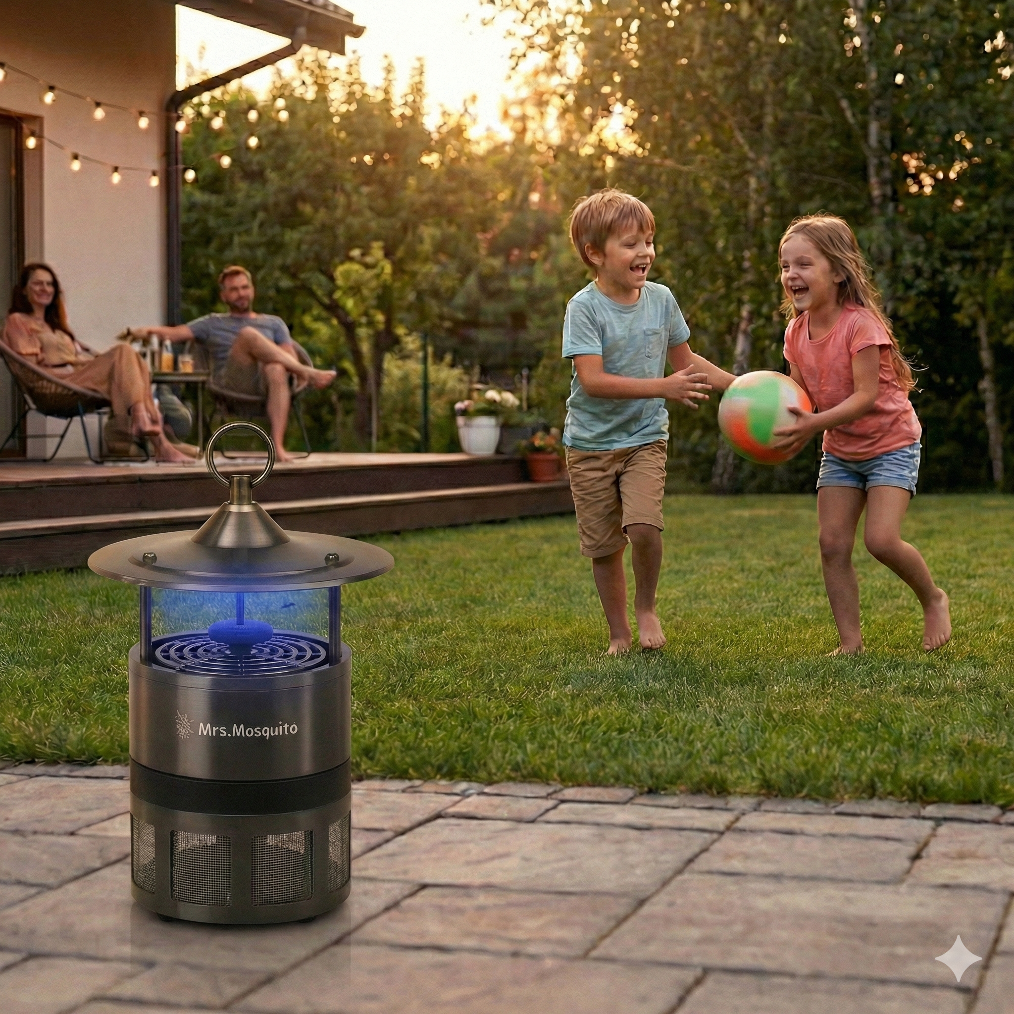 The MM400 is a premium outdoor mosquito trap designed for patios, backyards, cafés, restaurants, garages, and porches. Its stainless steel body provides durability while maintaining a clean, modern appearance.