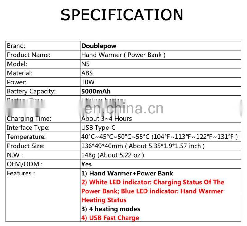 Doublepow Hot Sale 5000mAh Hand Warmer Power Bank Rechargeable Usb Power Bank Hand Warmer for Sale