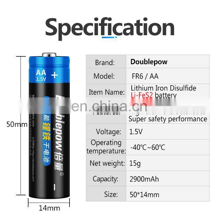 Lithium Iron Disulfide batteries offered by Doublepow are primary batteries. Now, there are two models: FR6 AA 2900mAh and FR03 AAA 1100mAh.