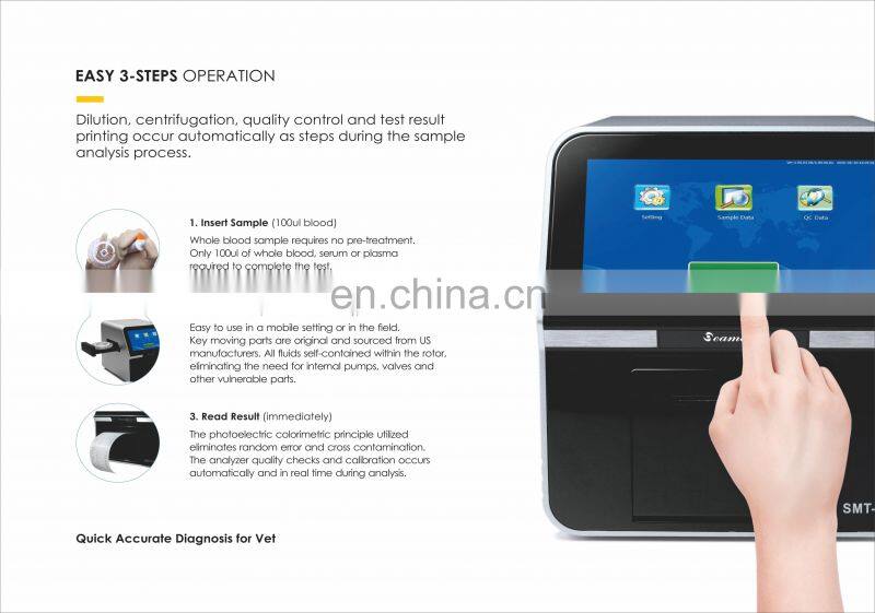 SMT-120VP is a state-of-the-art full automatic biochemical analyzer for animal diagnosis. SMT-120VP  can test up to 35 parameters at one time with precision reference laboratory quality results. No professional operation skills are required.  Full automatic operation, no need to add diluent and centrifuge. The test results will be printed automatically after 12 minutes.
