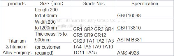 Baoji Firstti Titanium industry Group Co.LTD has built a smelting, forging and machining production line for titanium and titanium alloy and other non-ferrous metals, with an annual capacity of 2,000 tons of casting, 30,000 tons of forging and pressing and 6,000 tons of mechanical processing capacity. It can produce more than 50 kinds of titanium and titanium alloy products in three categories: titanium, titanium products and titanium equipment, mainly including: Ingot, bar, block, cake, ring, tube, plate, silk, different forgings, standard parts and tungsten, molybdenum, tantalum, niobium, pick, nickel, hafnium and other rare metal products.