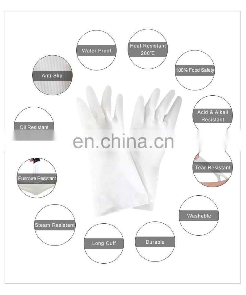 Water Proof Heat Resistant Food Safety Anti-acid Anti-alkali Anti-oil Steam Resistant Long Cuff Anti-Slip Tear Resistant Abrasion Resistant Puncture Resistant Washable Durable No Protein, No Skin Allergy. Environment-Friendly |