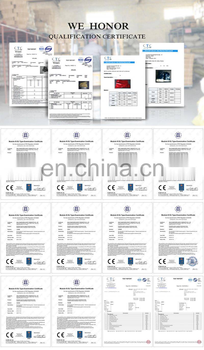 A:We are cooperating with CTC, and TUV test labs for many years. Most gloves with CE certificates (EN420, EN388,EN511,EN407)