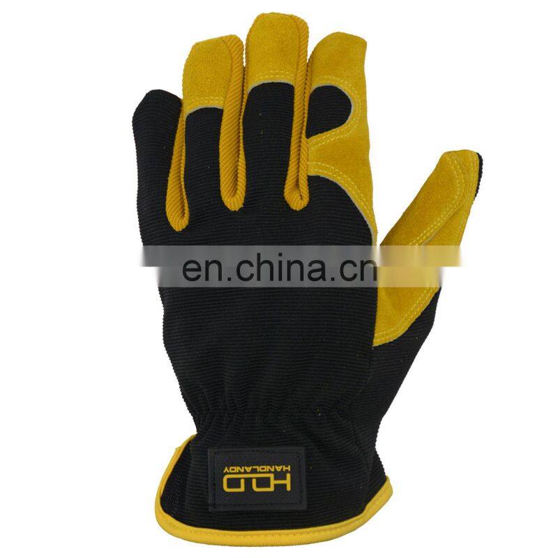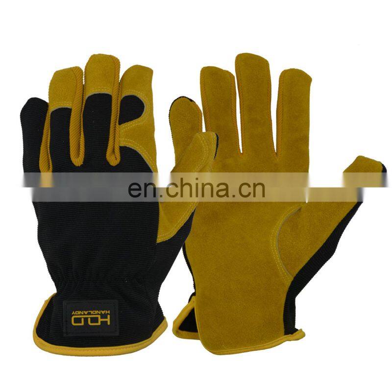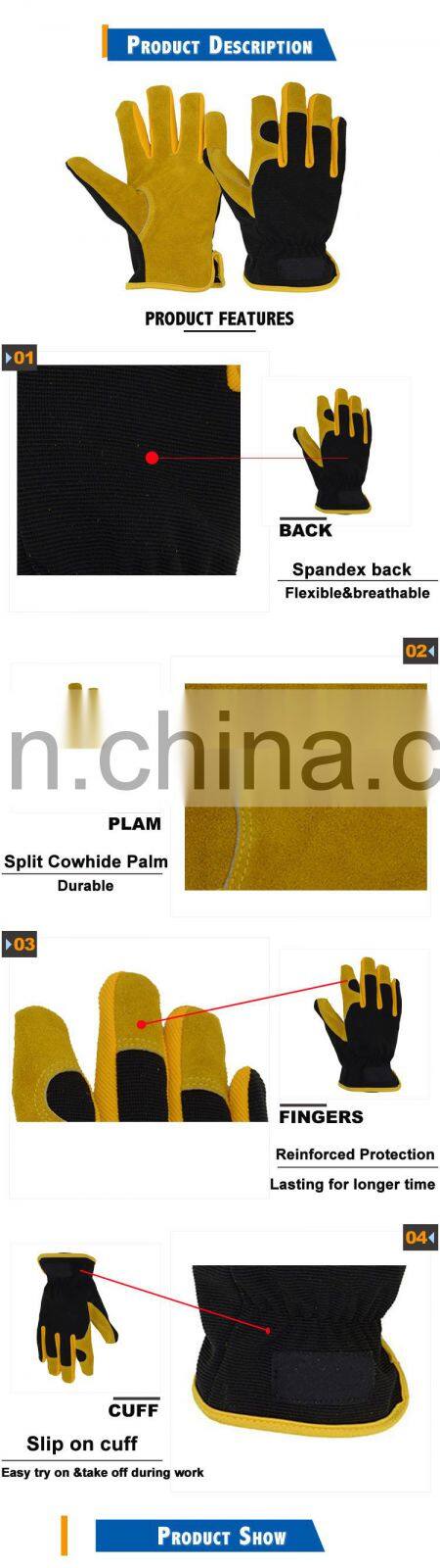 Yellow premium water repellent split cowhide palm spandex back Mechanic gloves for safety work,leather gloves working