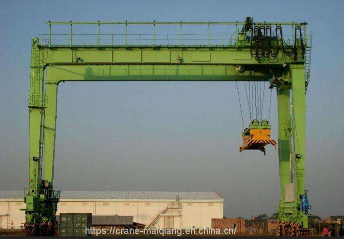 1. Rail mounted gantry crane is a kind of rail mounted crane used to offload, stack and load 20ft, 40ft, 45ft ISO standard containers. Its provision of power is offered by cable reel. The crane contains three mechanisms: hoisting, trolley travelling and gantry travelling. The trolley running along the track mounted on gantry beam is capable to serve among legs. The rail mounted gantry crane is able to make straight movement along rails.