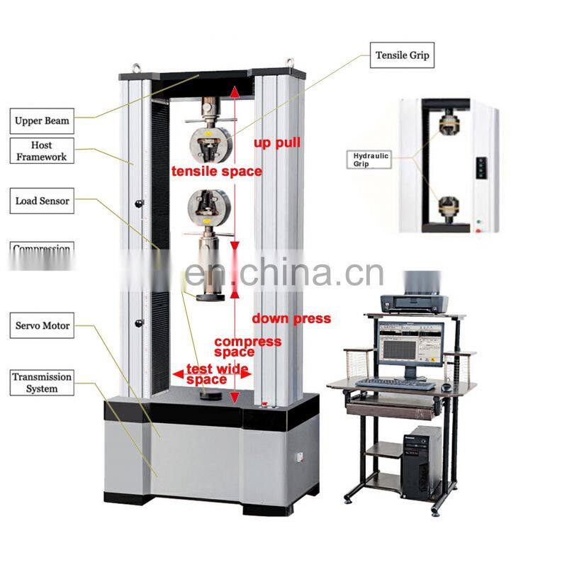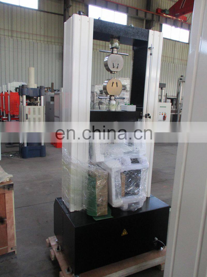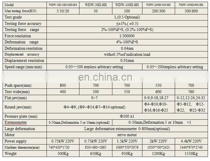 WDW 50D HS series electronic type testing machine is widely used for the mechanical testing of stretching, compressing, bending, shearing, peeling and tearing of non-metal materials, such as rubber, plastics, fabrics, electric wires and cables, composite materials, leather, waterproof roll, non-woven fabrics, earthwork cloth and paper sheets, etc. as well as the metal materials, such as metal wire, metal foil, metal sheets and metal bars, etc. The universal testing machine is suitable to be used in the fields, such as quality inspection, education and scientific research, aerospace, ferrous metallurgy, automobile industry and construction and building materials, etc.