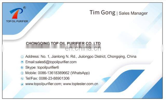 Chongqing TOP is a professional leading manufacturer and supplier of oil purifiers and various related testers. We consists of departments respectively for technological development, machinery manufacture, instrument manufacture, quality control etc. On basis of mature development and manufacture technology and highly qualified production management team, the products own high quality, easy operation, excellent performance and lone service life.