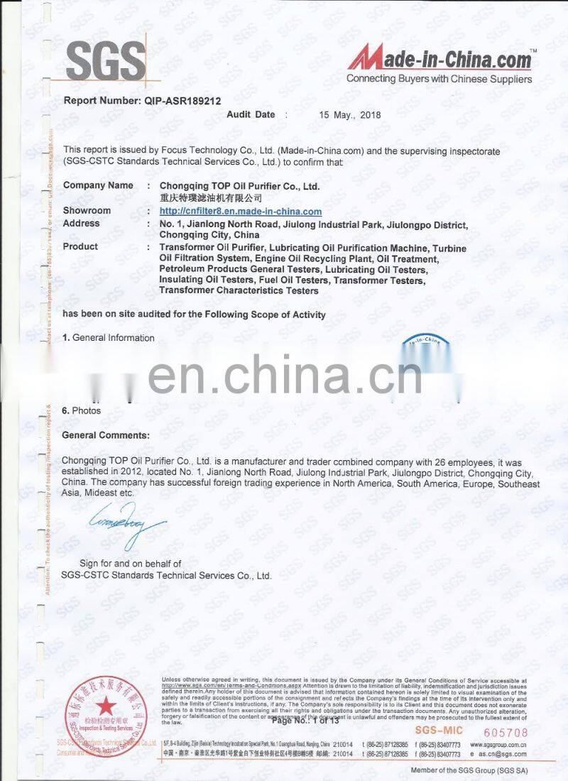 Located at Chongqing city--a southwest electromechanical manufacturing center as well as national municipality, Chongqing TOP is a professional leading manufacturer and supplier of oil purifiers and various related testers. We consists of departments respectively for technological development, machinery manufacture, instrument manufacture, quality control etc. On basis of mature development and manufacture technology and highly qualified production management team, the products own high quality, easy operation, excellent performance and lone service life.