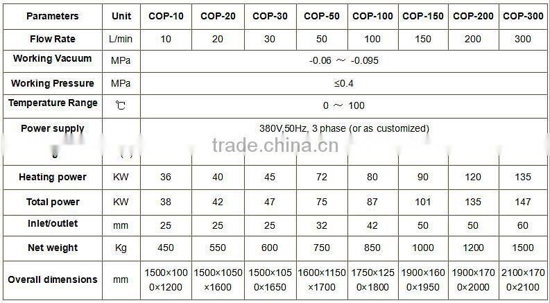 COP is for filtering waste cooking oil, dirty vegetable oil, trench oil, swill oil, animal oil etc. It effectively and completely removes particles, odor, water, acid, alcohol etc. from the waste oil. The treated oil is clean, limpidity, and with good smell. COP is an ideal purification machine for bio-diesel factory, fried food factory, oil restaurant, cooking oil factory, vegetable oil factory, waste oil collecting store etc. For edible usage of treated oil, we can make COP of stainless steel.