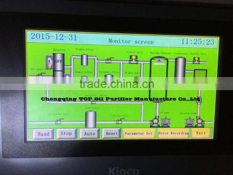 2. The primary filter of stainless steel is anti-rust and anti-corrupt. It mainly removes the residual impurities which escape from the press filter, making sure the treated oil won't have any impurity when it goes into the water separator and vacuum separator.3. The water separator mainly removes mass water from oil. After the water separator, the oil just contains the tiny water and soluble water.