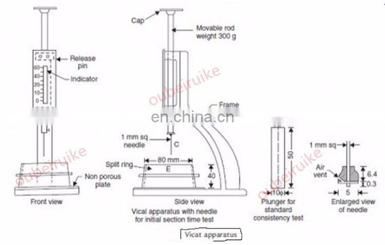 Standard forward instrument adopt 9597-1989 ( cement Test Method-Mixer Standard denseness water dosage,concreting time test ), is fit for Portland cement, normal Portland cement,scoria Portland cement,coal powder Portland cement,pozzolan Portland cement and compound Portland cement.This apparatus used to determine the quantity of water required to produce a cement paste of standard consistency. The apparatus consists of a metal frame with a sliding rod. An adjustable indicator moves over a graduated scale. The needle or plunger is attached to the bottom end of the rod to make up the test weight of 300 g. The Vicat testing apparatus is used to test the moisture content and setting time of standard cement paste, it is kind of common Cement testing equipment.