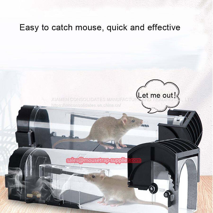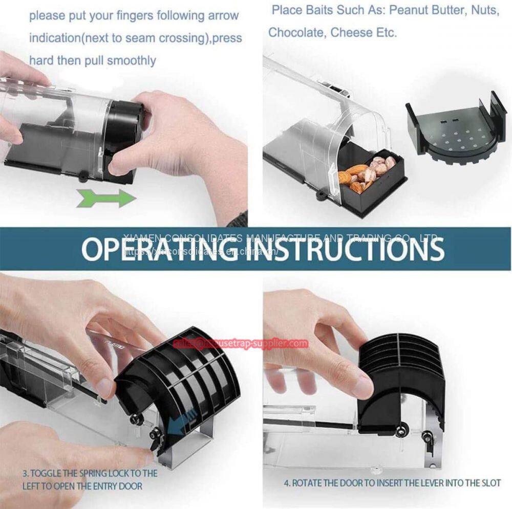 3. Humane mouse traps for indoors, just open the spring door at one end of the small lid of the mouse trap and put the bait into it. The mouse hole design reduces the alertness of the mouse. Once the mouse enters the mouse traps and touches the pedal, its weight and movement activate the spring mechanism. Finally, the door will close quickly. You can find that whether to hold the mouse through the transparent design and reduce contact with mice