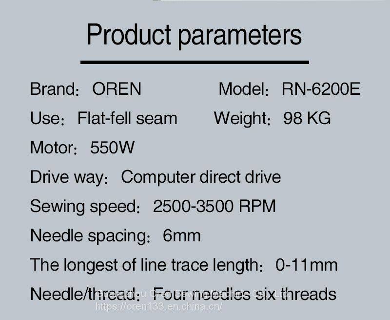 Oren original four needle six lines, that is, ISO607 lines, by four surface line, a bottom line and a thin line composition. Four needles six lines dedicated to the unique high elasticity, flat and flat-fell seam effect of high intensity, barrel type frame and the company's original walking presser foot, in flat-fell seam high elastic fabrics and linden seam and more relaxed, depending on the fabric and use has a variety of specifications of the presser foot needle group parts corresponding to the single cut type double cut type, and small servo motor, become an organic whole repeatedly with the pursuit of high quality sewing and tube of new single operational models. Among them, in order to ensure the equipment to maintain the best effect in the use process, improve the production efficiency for dear friends, create maximum value, more durable; The baby's core components are produced by the Japanese factory to provide, so dear friends on the quality can be absolutely assured!