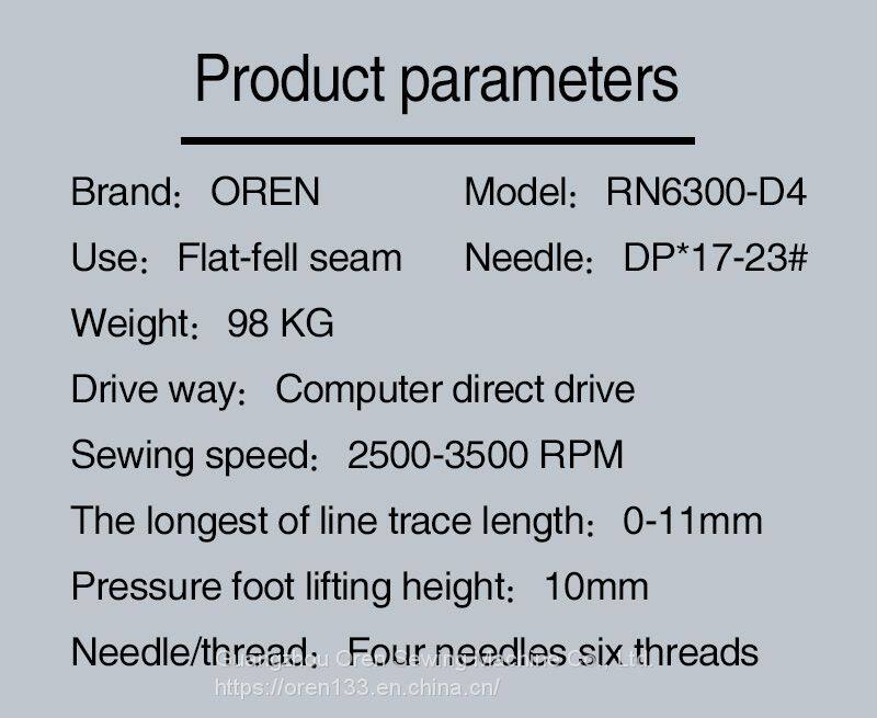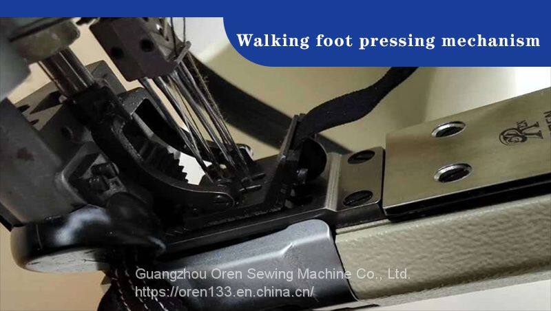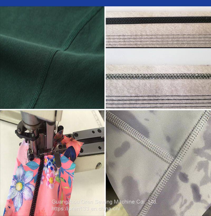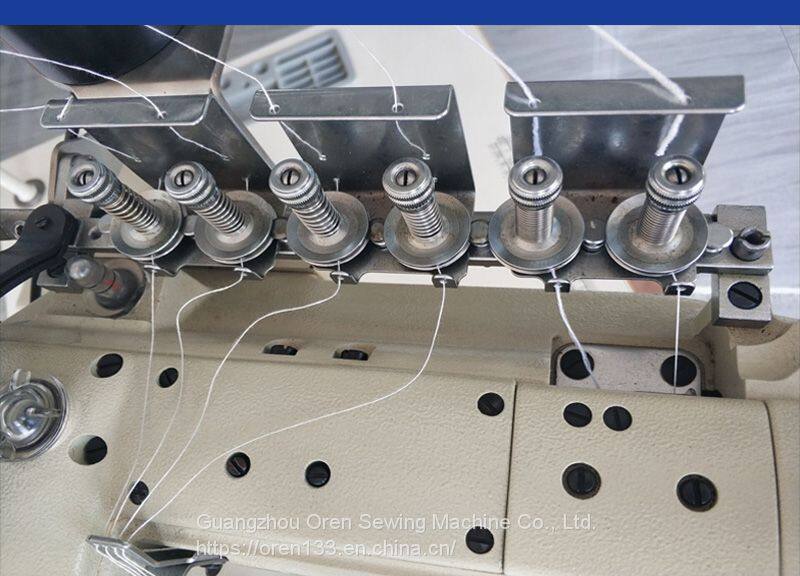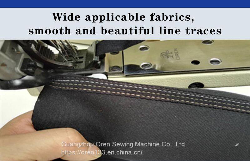 OREN original four needle six lines, that is, ISO607 lines, by four surface line, a bottom line and a thin line composition. Four needles six lines dedicated to the unique high elasticity, flat and flat-fell seam effect of high intensity, barrel type frame and the company's original walking presser foot, in flat-fell seam high elastic fabrics and linden seam and more relaxed, depending on the fabric and use has a variety of specifications of the presser foot needle group parts corresponding to the single cut type double cut type, and small servo motor, become an organic whole repeatedly with the pursuit of high quality sewing and tube of new single operational models. Among them, in order to ensure the equipment to maintain the best effect in the use process, improve the production efficiency for dear friends, create maximum value, more durable; The baby's core components are produced by the Japanese factory.