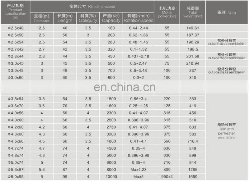 Actived new rotary kiln widely used is the key equipment in cement industry for calcinating clinker. It is also used in varies industries, such as metallurgy, Chemical, building, rehractory material, environmental production, etc. The kiln is composed of the cylindrical shell, roller supporting device with thrust roller, driving gear unit movable kiln hood, sealing device at kiln inlet, coal dust pipe device etc.
