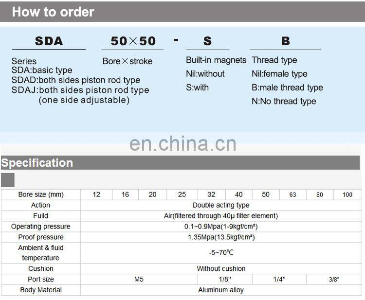 New Design SDA Series Good Price Thin Double Acting Stroke 5-100mm Compact Air Pneumatic Cylinder