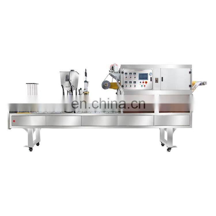 High productivity auto yogurt plastic cup filling and sealing machine can be used for filling a variety of objects at one time, and the unique blender can mix the sauces. The packaging is more uniform and smooth, and it is not easy to form jams. It is suitable for yogurt, juice, water and varies beverage.