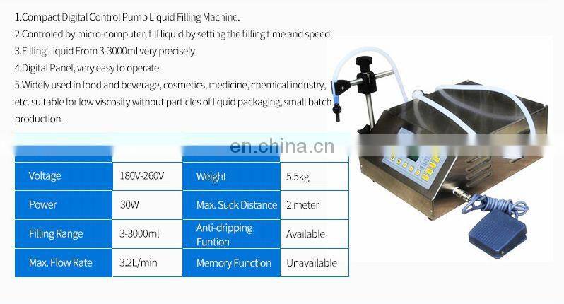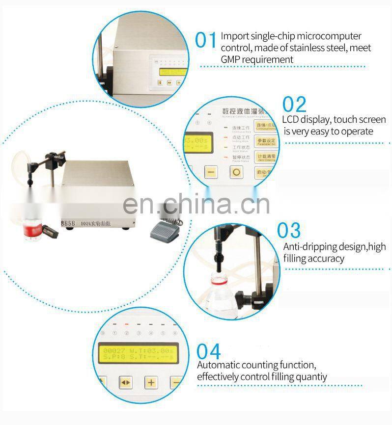 Hot Sell Electric Liquid Mineral Water Juice Bottle Filler Small CNC Filling Machine with high precision and easy operation. Exquisite technology creates high quality, suitable for a variety of beverages, white wine, soy sauce, vinegar, juice, essence skin care products, essential oils, perfumes and other liquid products. Anti-drip setting of the discharge port, humanized design, durable, high filling accuracy and accurate measurement. Equipped with a new LED control panel, computer control, simple operation, more accurate operation. The model is small, the design is