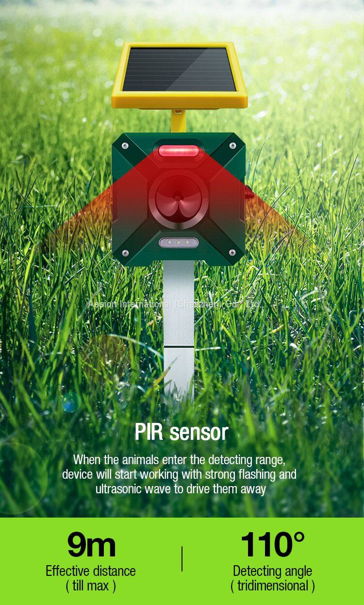 When Animals enter the protected area, the product emits a strong ultrasonic sound and LED flashing which frightens,