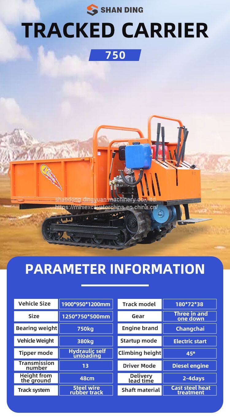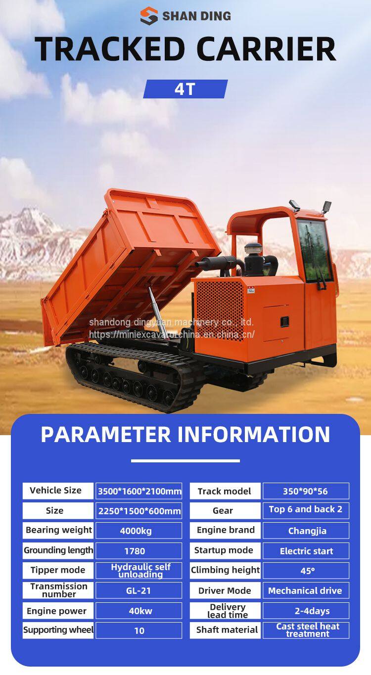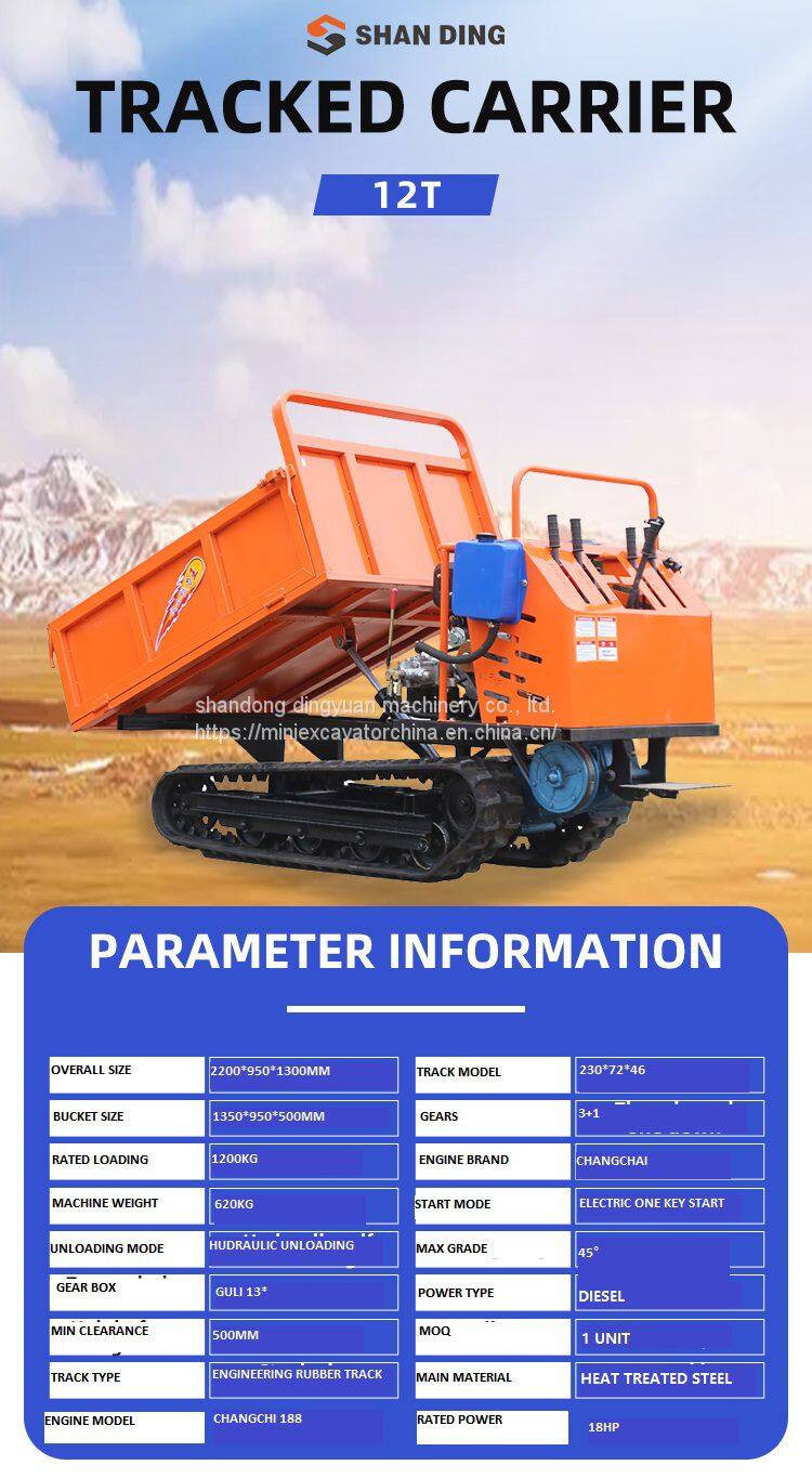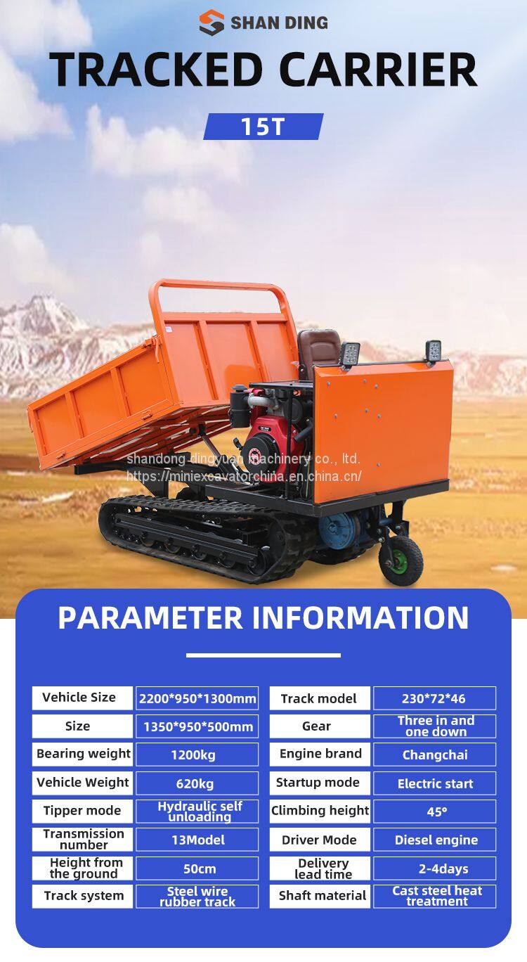 The rubber tracked dumper utilizes a bolt-on dumper bed instead of a traditional welded on bed so the bolt on accessories and options can be changed out regularly to make the most of the rubber tracked dumper carrier. The SHANDING tracked dumper is built to exceed expectations and keep pace with your operation's expanding requirements.Since the rubber tracked dumper does have rubber tread instead of steel the limitations of the work environment is far less limited. Wheeled dumpers can get caught in the mud but a rubber track dumper will crawl right over most terrain without issue. The only concern to really have with a rubber track dumper is how many loads you can try to fit into one day because it will just keep going if you can. The rubber tracked dumper is reliable, safe, and customizable to work with not just the dumper bed but rigs and accessories as well.