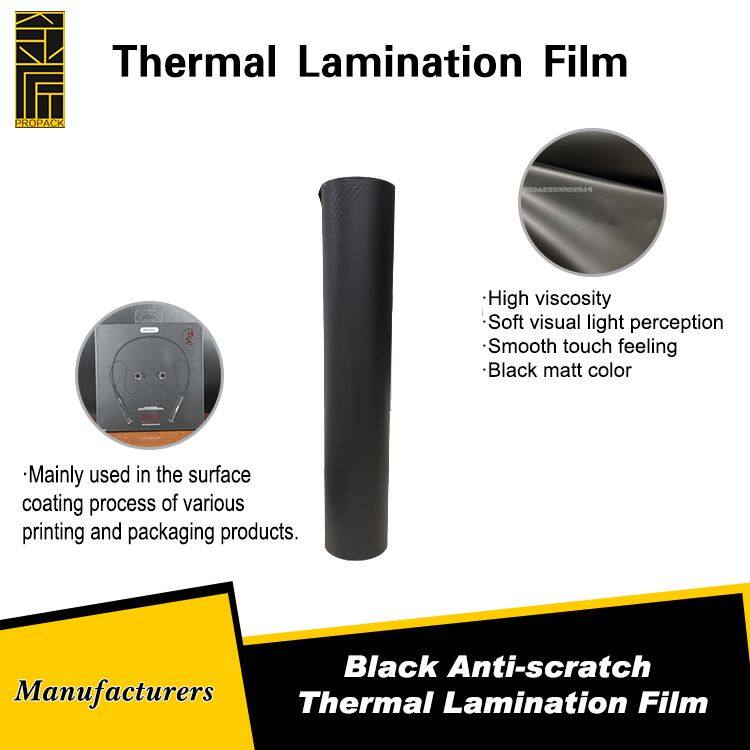 Black Anti-scracth matt thermal lamination film is also called pre-coated black anti-scratch matt lamination film, it is one kind of bopp matt lamination film with scratch-resistant and abrasion-resistant function, and it already has the adhesive pre-coated on it.