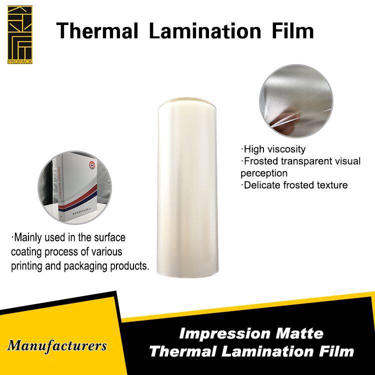 Impression Matte thermal lamination film is also called pre-coated impression matte lamination film, impression frosted thermal lamination film, it is one kind of bopp matt lamination film with soft visual light perception and a frosted texture, and it already has the adhesive pre-coated on it.