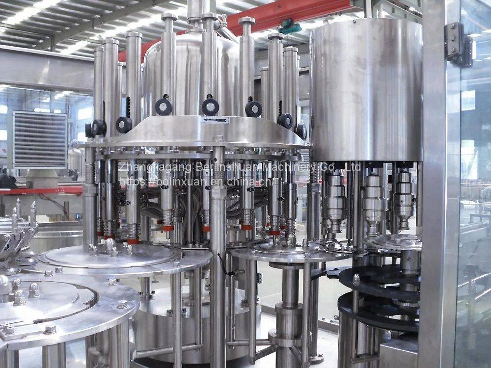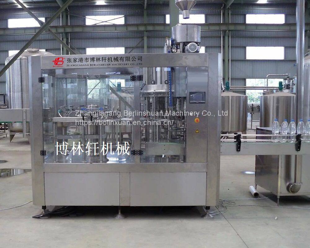 CGFR series automatic beverage hot filling machine, this machine set washing, filling, capping three machine introduced Italian technology, precision manufacturing, can line of aseptic filling, increase the constant temperature system, replace part of the accessories, can adapt to heat PET bottles, juice, tea, drinks and other hot filling process requirements. The unit is simple in operation, small in area, compact in structure, suitable for PET bottles of various non-gas drinks (mineral water, pure water, distilled water, fruit juice, tea, drinks, etc.) at room temperature or hot filling, also use vinegar and other liquid cleaning, filling, sealing. The line is simple in design, novel in style, simple in function, strong in adaptability, convenient in operation, beautiful in appearance and high in automation. It is the filling equipment of juice tea beverage at home and abroad.