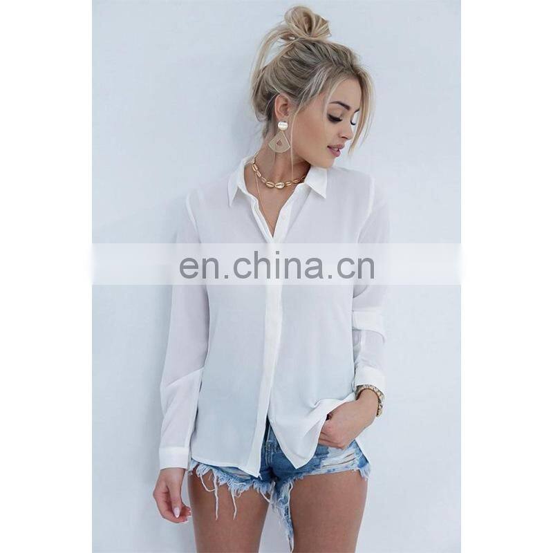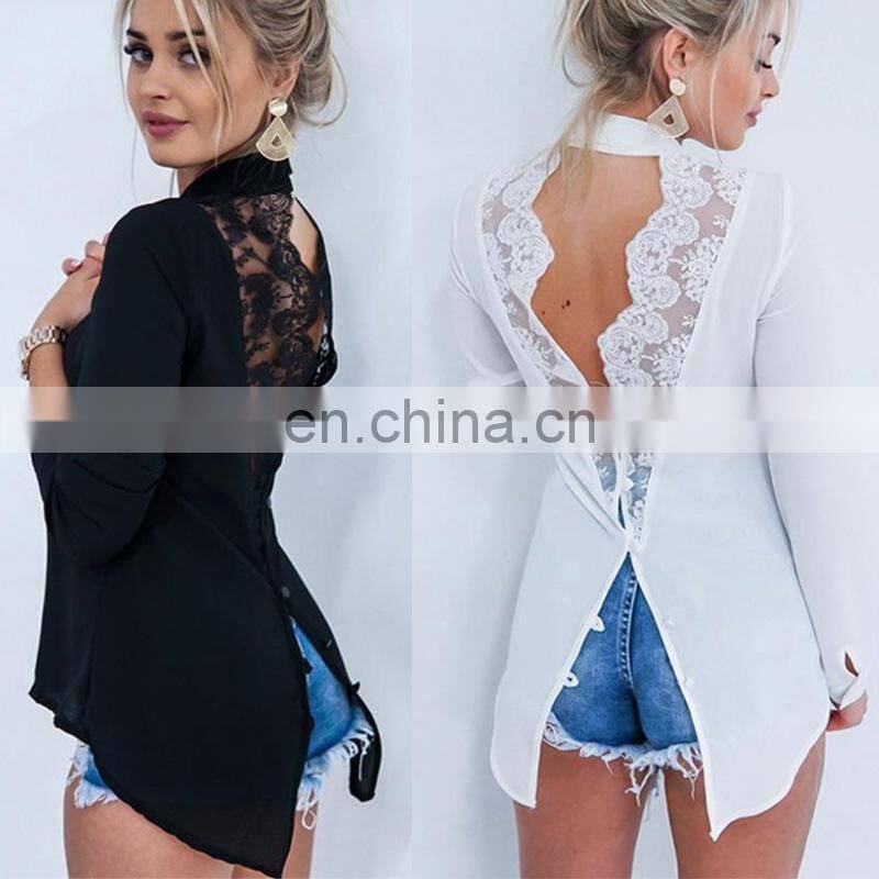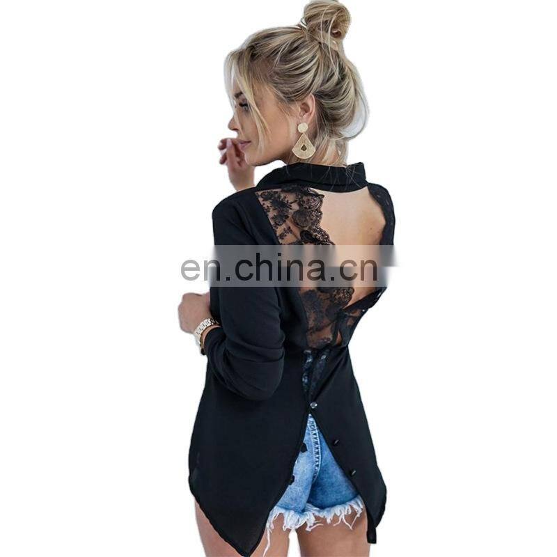 Wholesale Custom Women's Tops New Fashion Western Style Backless Lace Splicing Lapel Long Sleeve Irregular Chiffon Shirt
