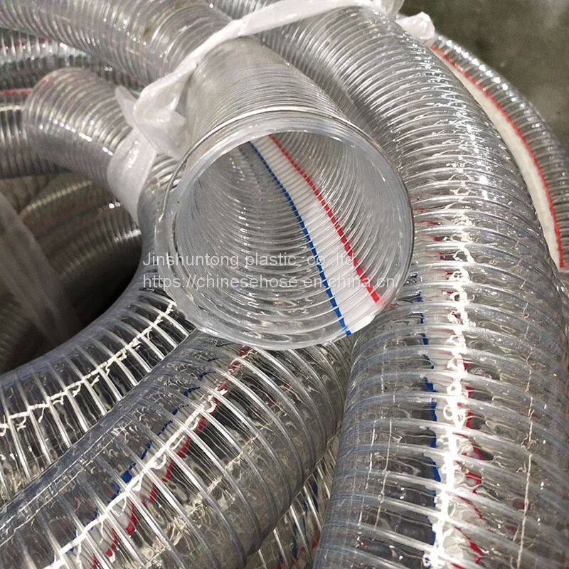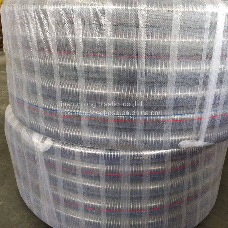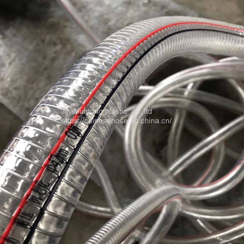 This hose, with steel screwing inlaid in the hose, which with small bending radius, no smells, no poison, light, transparent. It has good adaptability to hard weather conditions and minus pressure. Be enduring of high intensity, strong pulling force, and convenient for installation and transportation. With colorful symbol lines on the surface of the hose, it can more beautiful.