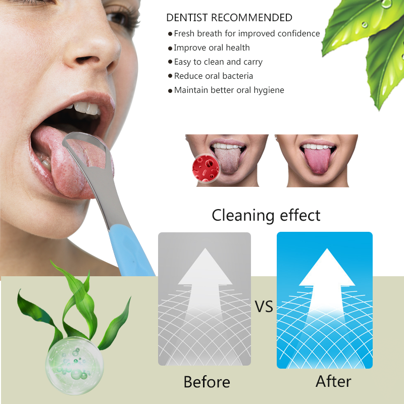 Why do you choose tongue scraper Cleaning the tongue is an important part of keeping good oral health.It reduces bad breath on the tongue and reduce oral bacteria, enhances the sense of taste.Use the scraper to clean your tongue twice per day(morning & night) , thus bad breath will be removed, bring you fresh breath and more confidence.