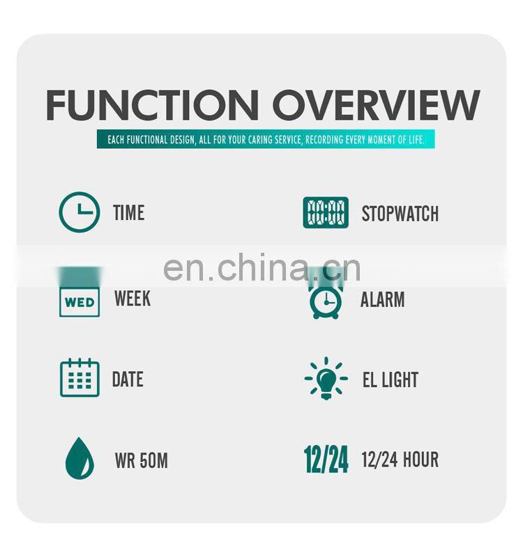 Time,week,date,alarm,chrono,LED light,12/24 hour clock |
