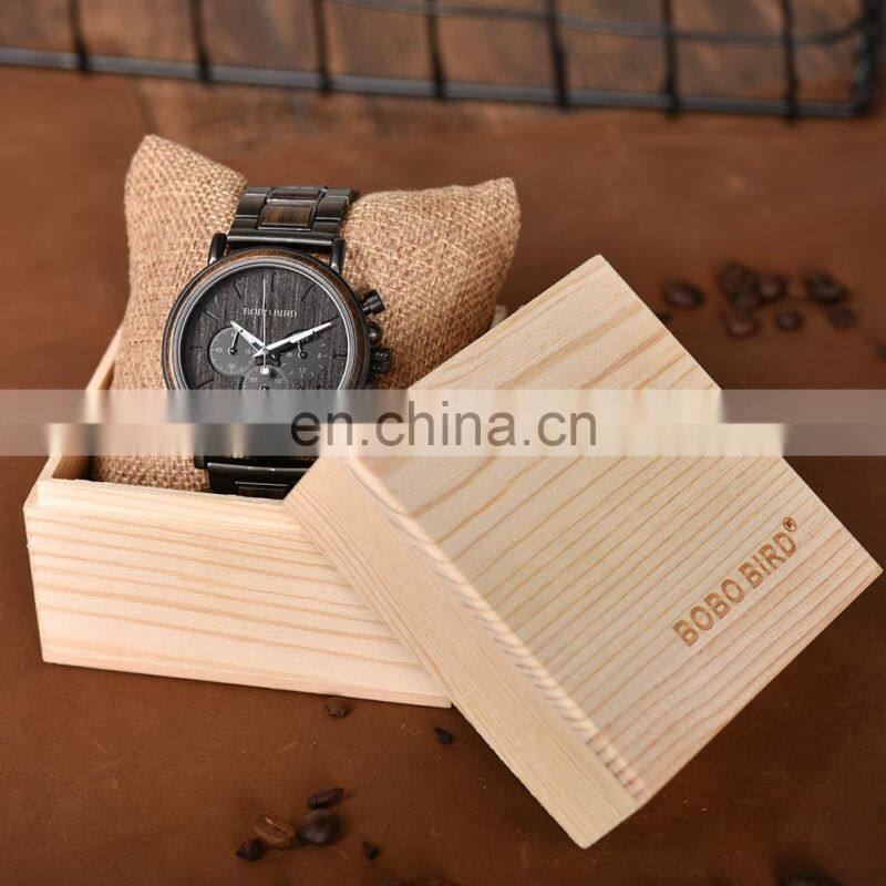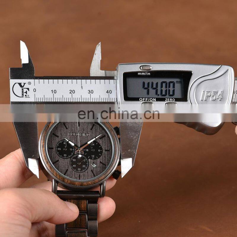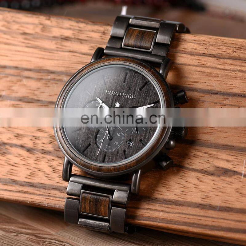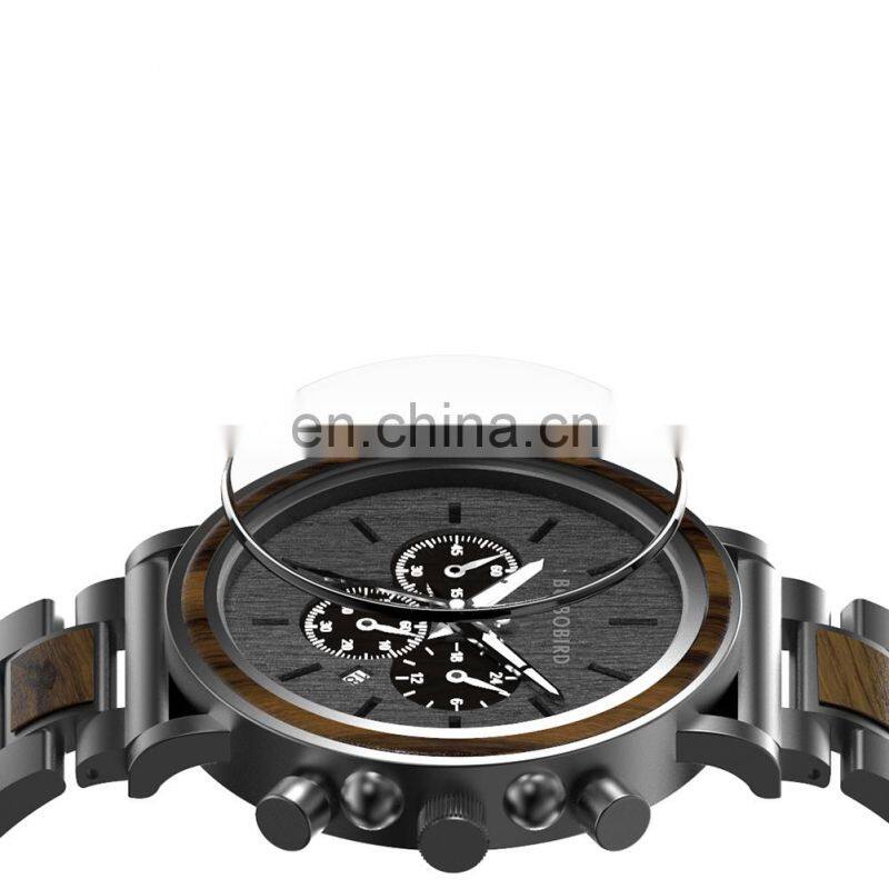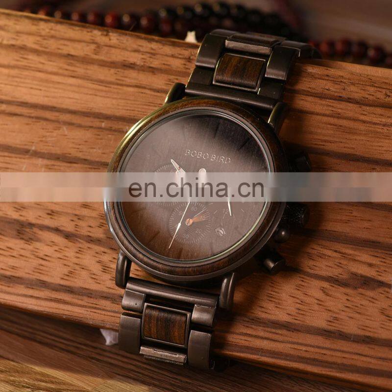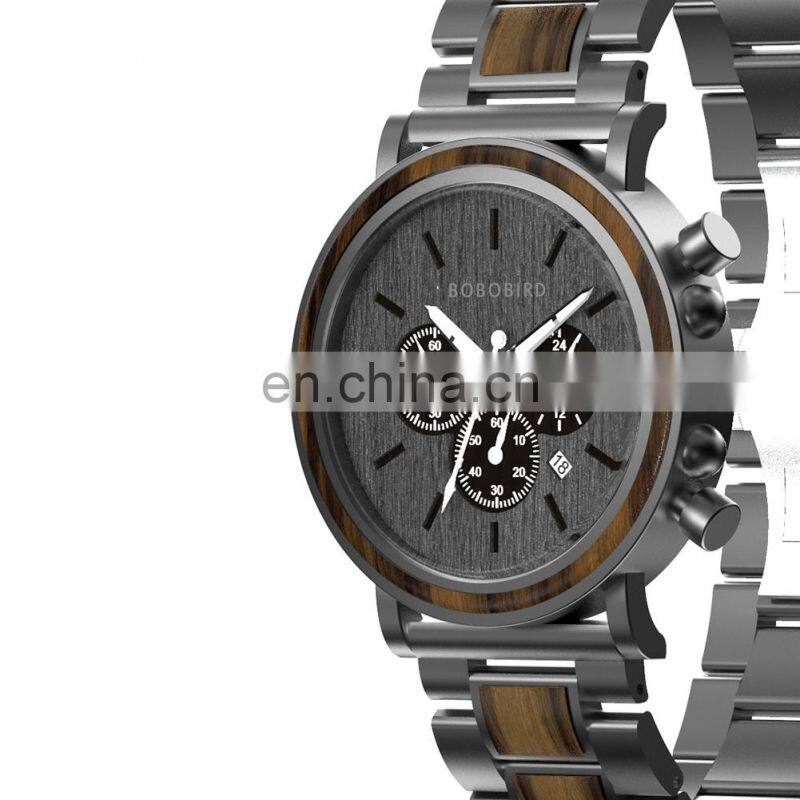 BOBO BIRD Wood Military Watch Men Stainless Steel Auto Date Display Chronograph Wristwatch Luminous Hands Customize Gift