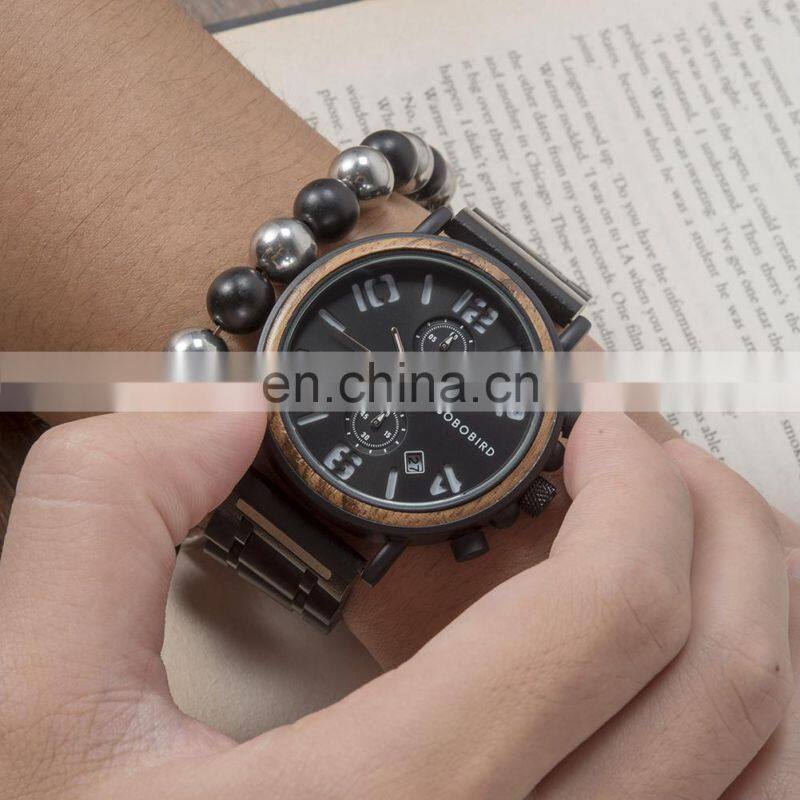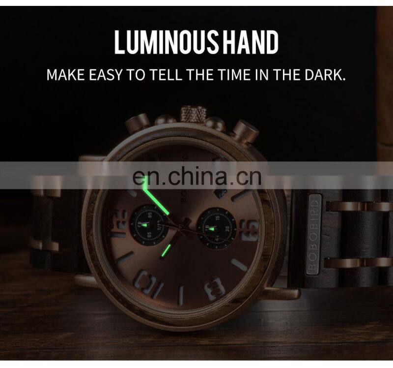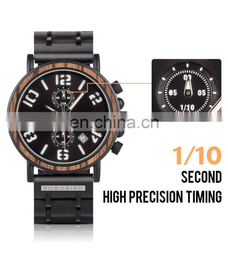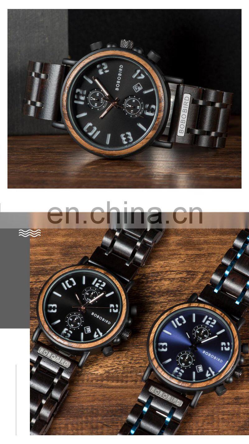 BOBO BIRD Wood Military Watch Men Stainless Steel Auto Date Display Chronograph Wristwatch Luminous Hands Customize Gift