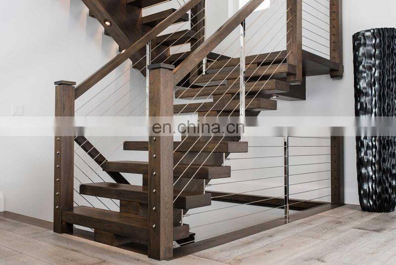 Cable Railing Stairs Wood Tread Mono Beam Stairs With U Shaped Steps