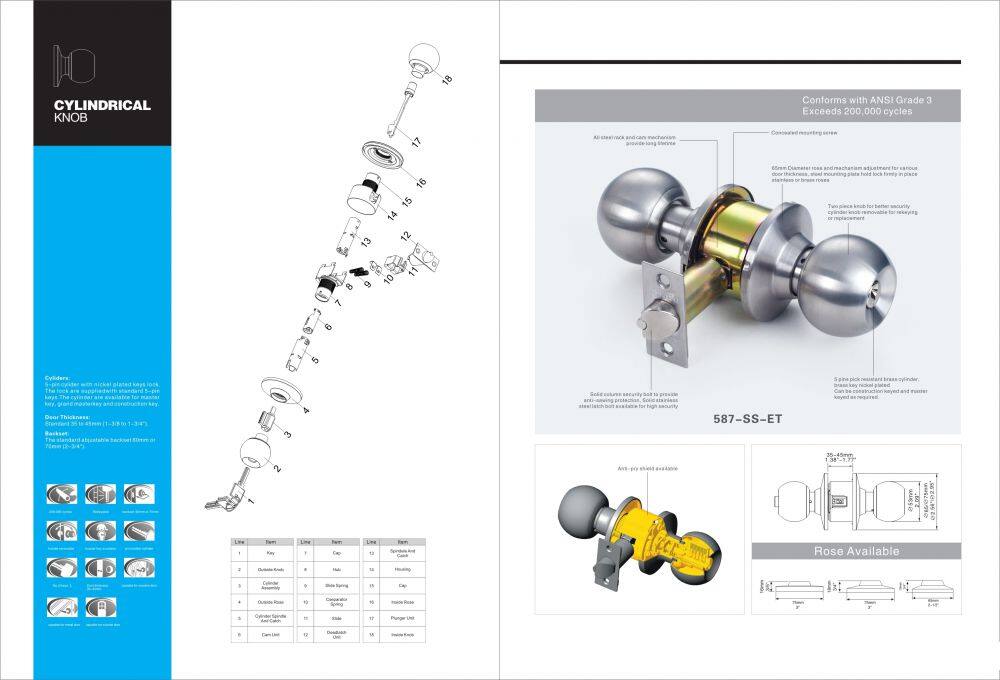 Material: knob : zinc alloy / SUS201 / SUS304, finish color: mainly satin stainless steel round rosette : zinc alloy / SUS201 / SUS304, finish color: mainly satin stainless steel lock cylinder : solid brass key : 3 to 5 pieces, iron or brass, nickel plated deadlatch face plate : SUS201 / SUS304, finish color: mainly satin stainless steel deadlatch strike plate : SUS201 / SUS304, finish color: mainly satin stainless steel latch bolt : zinc alloy or brass regular logo : our own logo / no logo custom logo : engraved logo / laser logo, regular packing : white box / color box / blister card / slide card / double blister / gift box, etc. custom packing. : available, under MOQ |