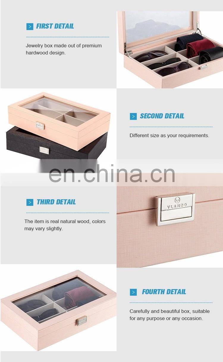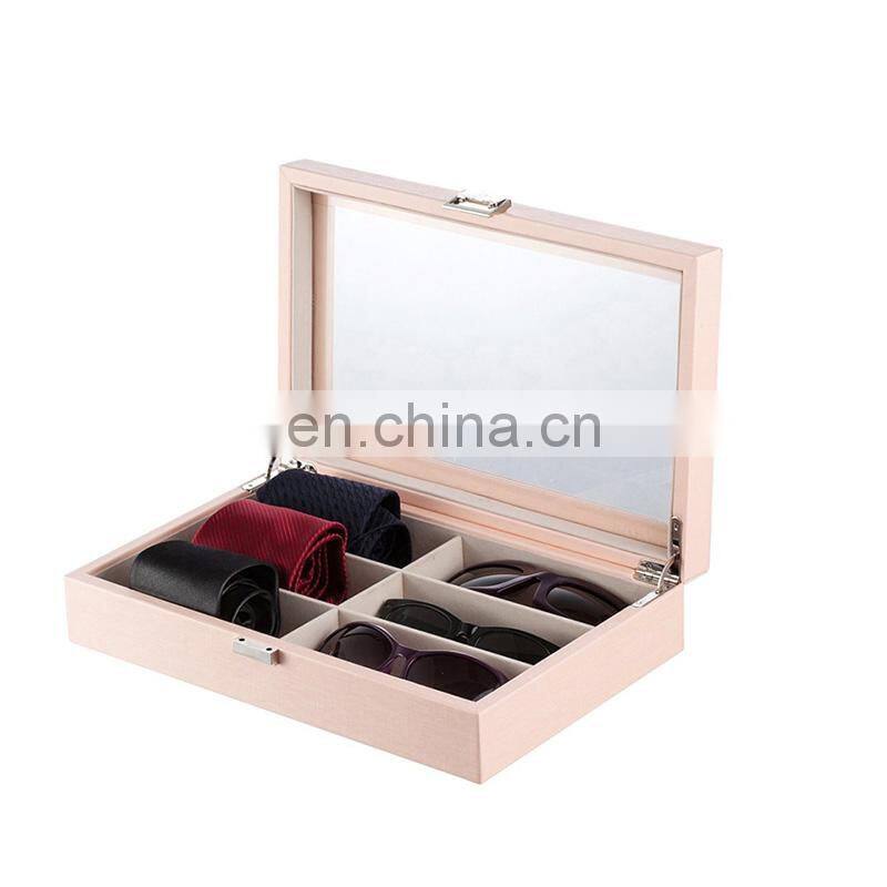 The fabric-lined interior boasts 6 divided removable compartments for displaying and storing sunglasses, ties, jewelries, and a variety of collectibles
