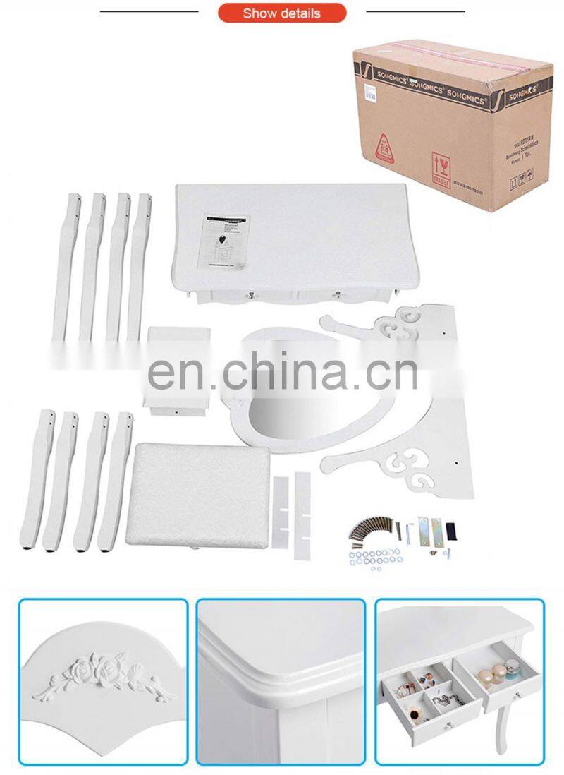 Perfect craft - Made of woods and E1 density boards; elegant looking by the painting on the surface and delicate carve patterns on the mirror frame and stool; anti-slippery parts fixed in the leg bottom to avoid scratching your floor