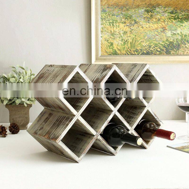 Rustic Torched Wood Wine Rack, Geometric Design 8-Bottle Storage Organizer