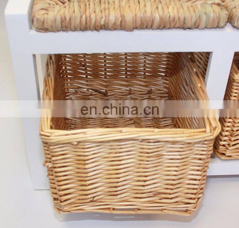 White Two Seater Wooden Storage Bench with Wicker Baskets and Seating